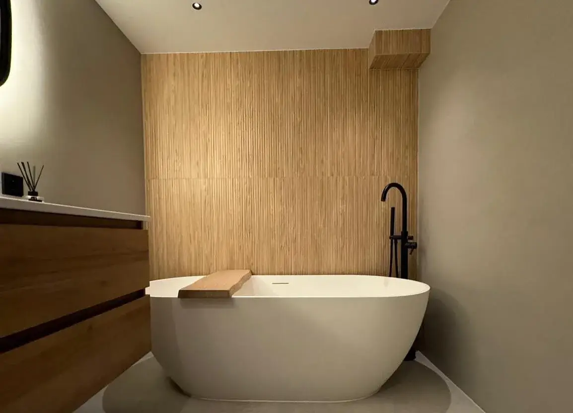 Deze prachtige badkamer mogen realiseren voor een klant in Scheemda. Met mooie natuurlijke tinten is deze badkamer zeer sfeervol geworden.